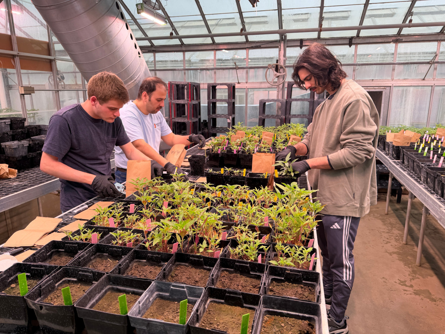 Lukas Holderby, Sabeel Abuhakmeh, and Dr. Ahmad Mobli harvesting a controlled-environment study at UW-Madison Walnut Street Greenhouse evaluating soil-residual herbicide performance in high-biomass cereal rye systems. Twenty-one single–active-ingredient corn and/or soybean herbicides were assessed for waterhemp control; not all products were equally effective or compatible with high cover crop biomass. This image highlights the mission of the WiscWeeds Lab: delivering timely, research-based recommendations while training the next generation of agricultural professionals.